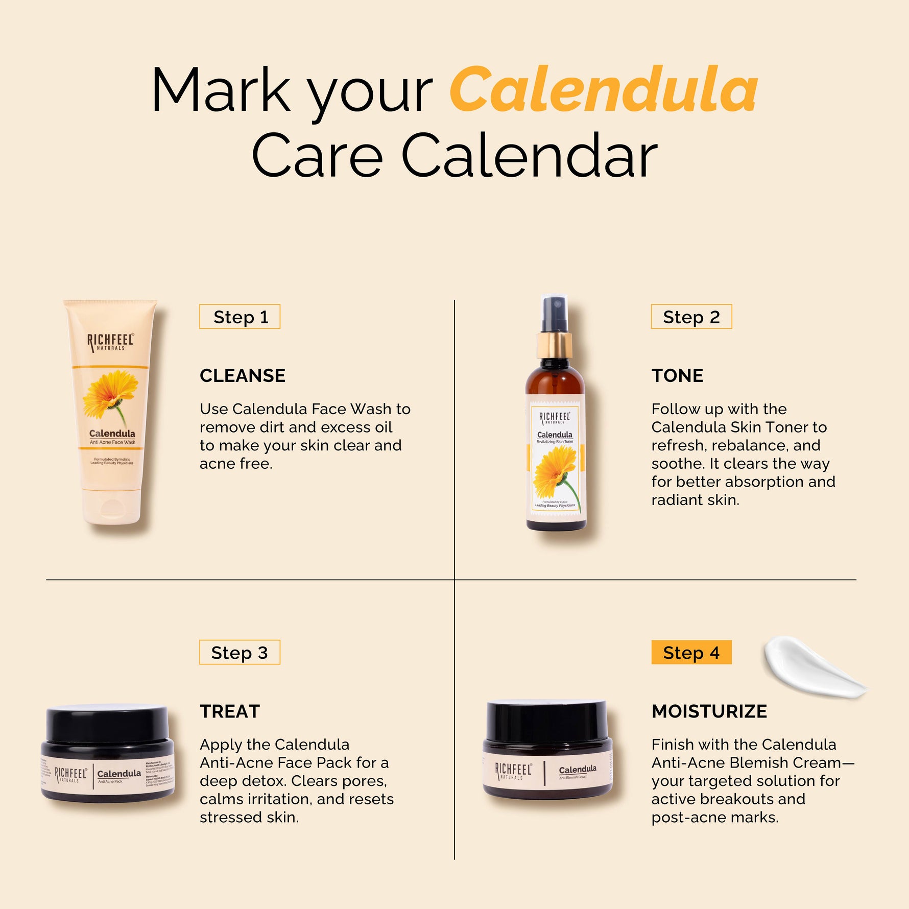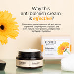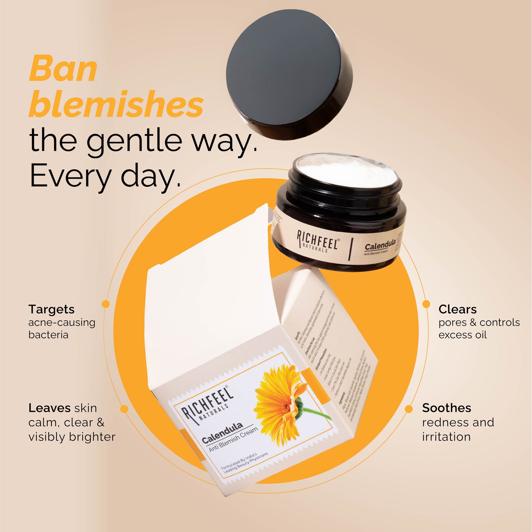 Richfeel Calendula Anti-Blemish Cream is a gentle, daily solution for acne-prone and blemished skin. Powered by Calendula Extract, Berberis Aquifolium, Echinacea, and Thuja, this non-comedogenic cream targets acne at its source while calming irritation and promoting skin repair. Glycerine hydrates, while Stearic Acid and Cetyl Alcohol help restore skin’s moisture balance and barrier health. With consistent use, expect visibly clearer, calmer, and smoother skin — without dryness or residue. Crafted by India’s original beauty physicians with 40+ years of clinical expertise, this blemish cream delivers targeted care you can feel good about.