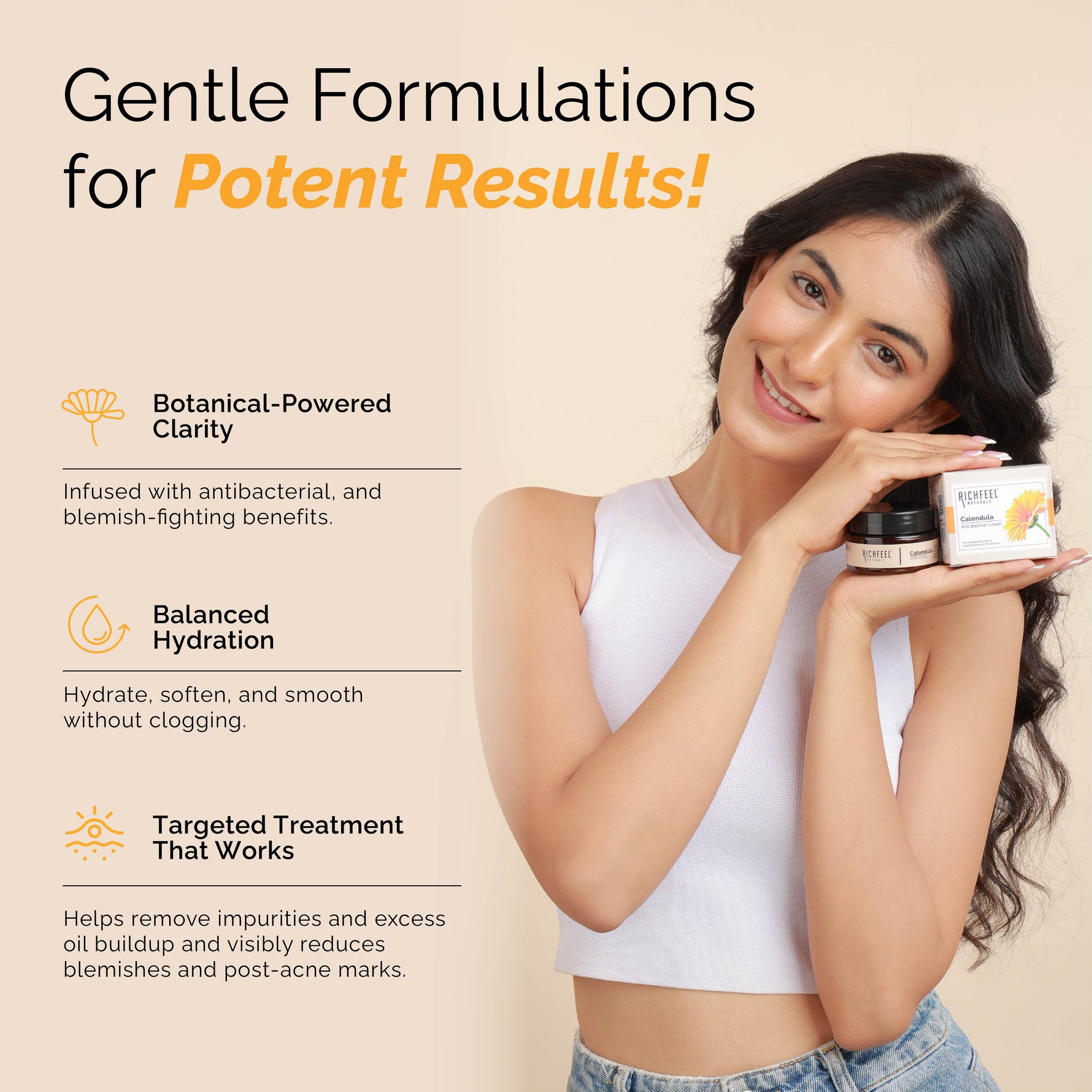 Richfeel Calendula Anti-Blemish Cream is your go-to daily treatment for clearer, calmer skin. Expertly formulated with botanical actives like Calendula Extract, Berberis Aquifolium, Echinacea, and Thuja, it tackles acne and blemishes at the root. Glycerine keeps skin hydrated, while Stearic Acid and Cetyl Alcohol help restore skin barrier integrity. Lightweight, non-comedogenic, and dermatologist-backed — this cream is