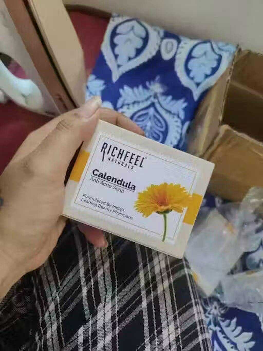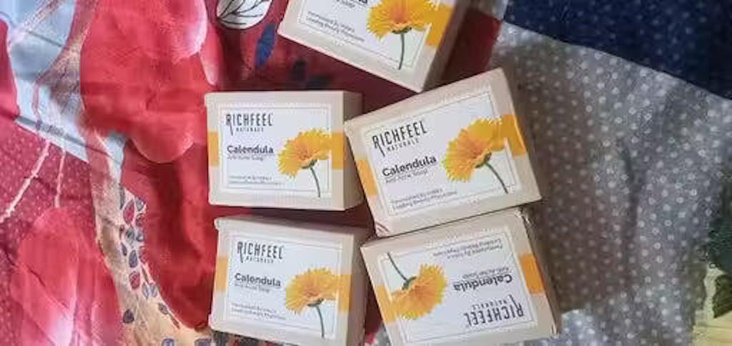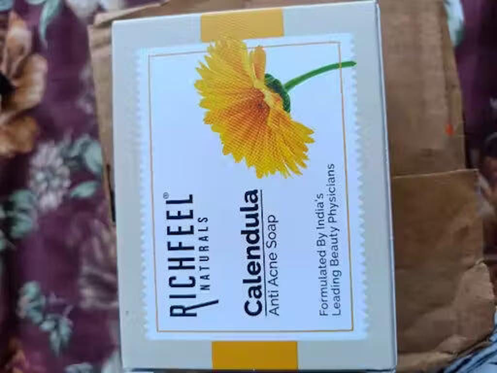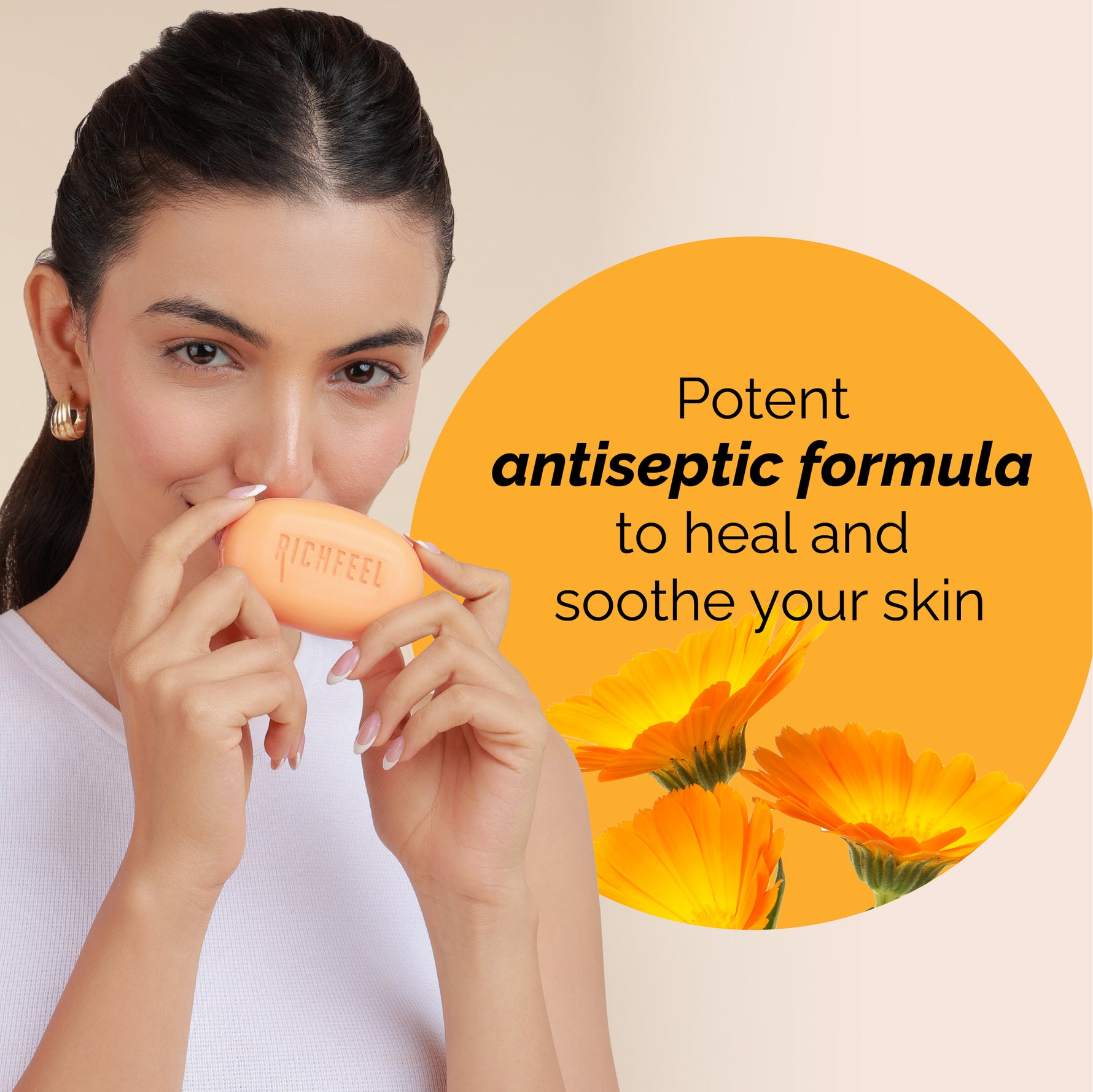 Richfeel Naturals Anti-Acne Calendula Soap. Crafted by India’s OG beauty experts, this soap blends the power of Calendula with a clinically gentle formulation to fight breakouts, calm irritation,and reveal visibly brighter skin—every single wash.