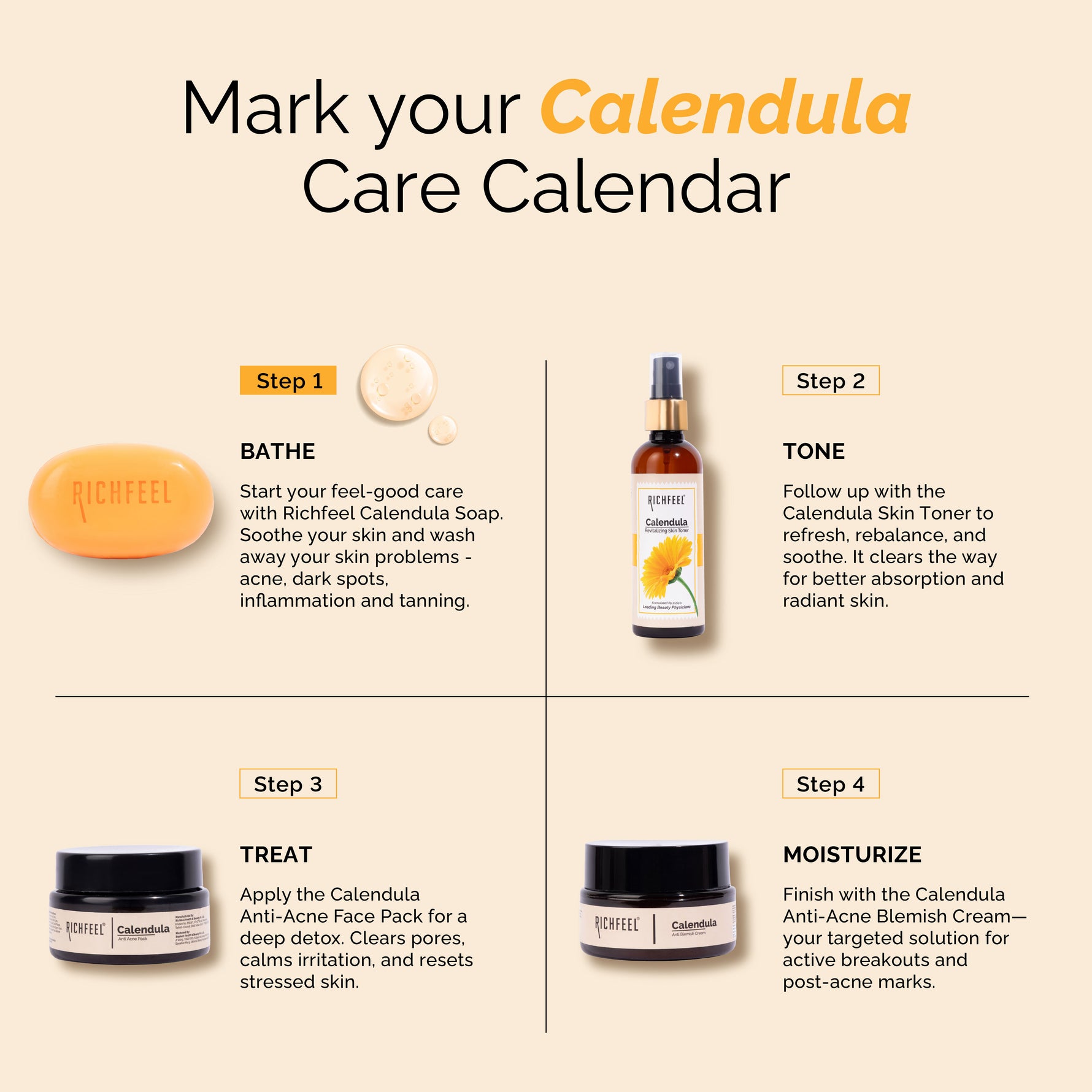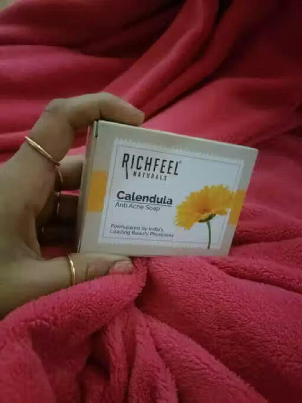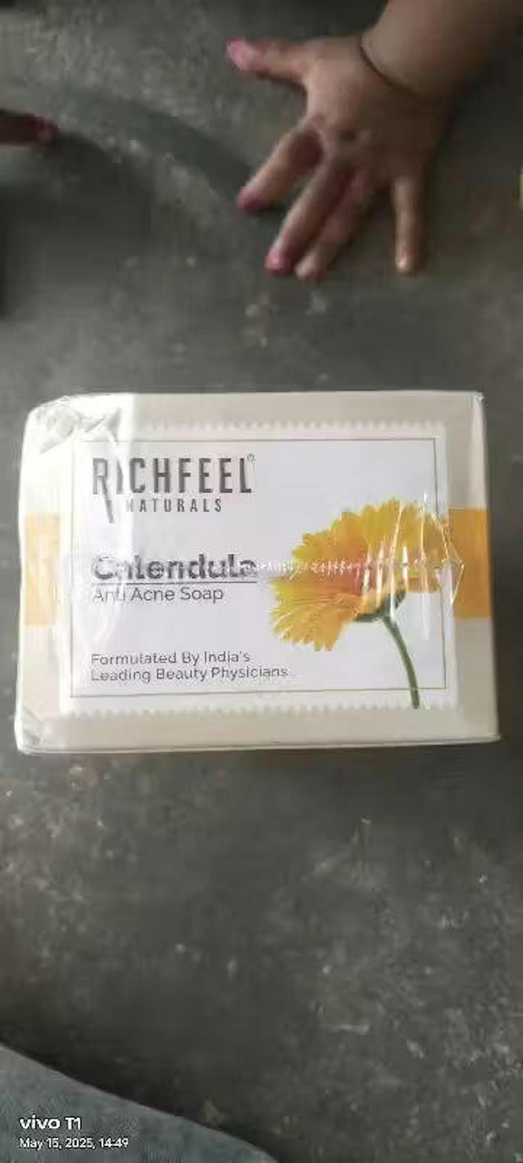 Richfeel Naturals Anti-Acne Calendula Soap. Crafted by India’s OG beauty experts, this soap blends the power of Calendula with a clinically gentle formulation to fight breakouts, calm irritation,and reveal visibly brighter skin—every single wash.