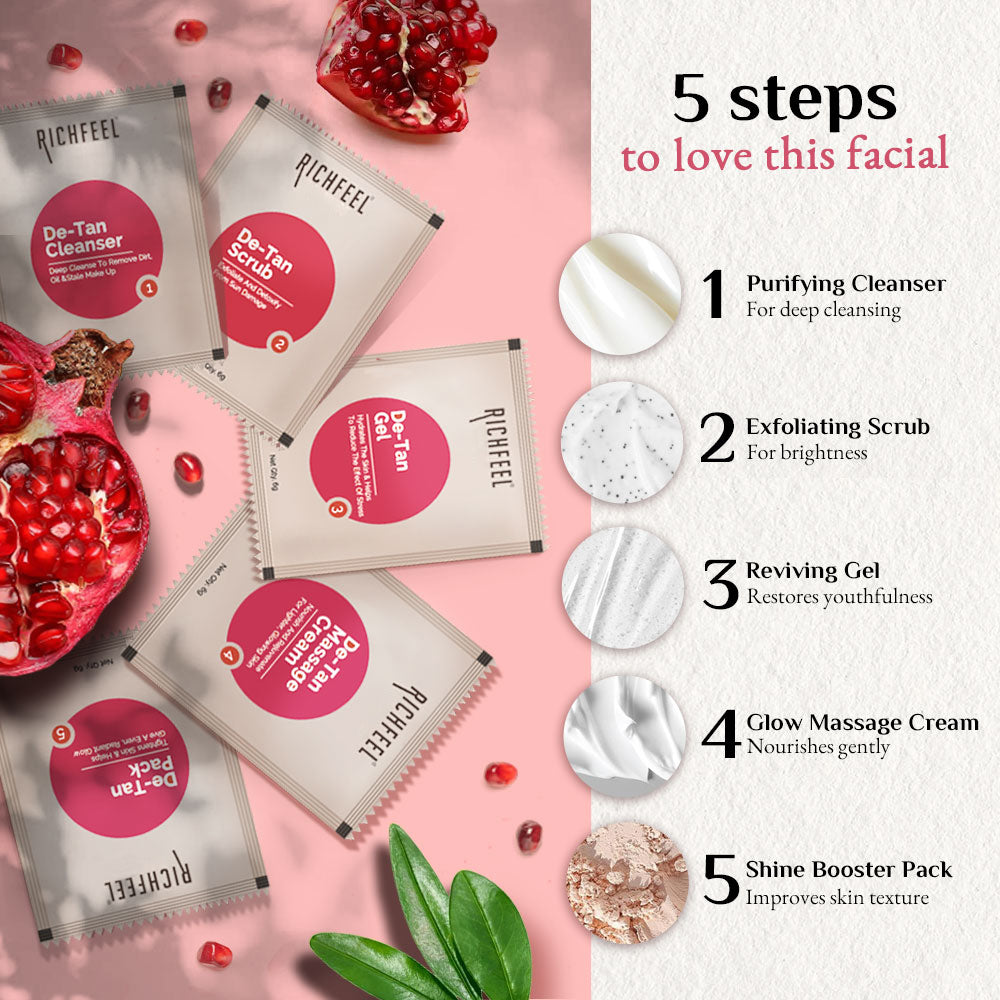 Richfeel Detan Facial Kit with Pomegranate & Botanical Actives helps remove tan, reduce pigmentation, and bring back your natural glow.Expertly formulated by India’s OG beauty physicians, this 5-step regimen gently exfoliates dead skin cells, clears out impurities, and hydrates deeply—leaving your skin smoother, brighter, and visibly even-toned.With antioxidant-rich pomegranate and skin-reviving botanicals, it nourishes from within to restore lost radiance and protect against future dullness.