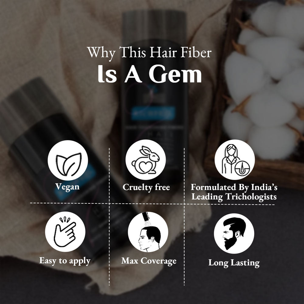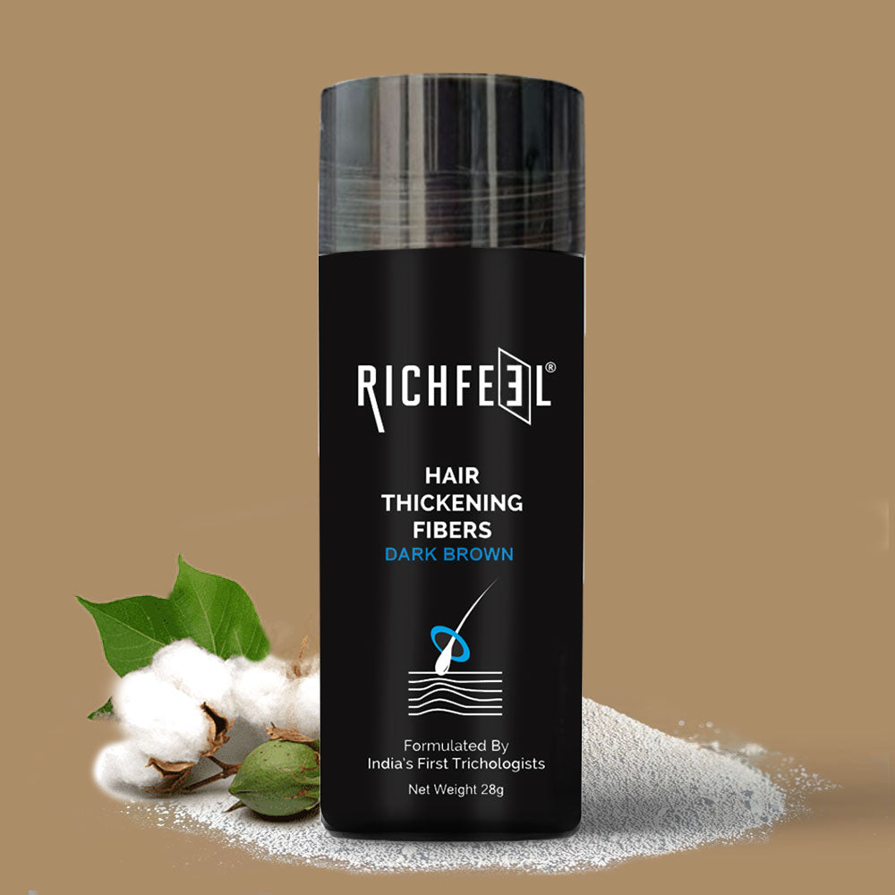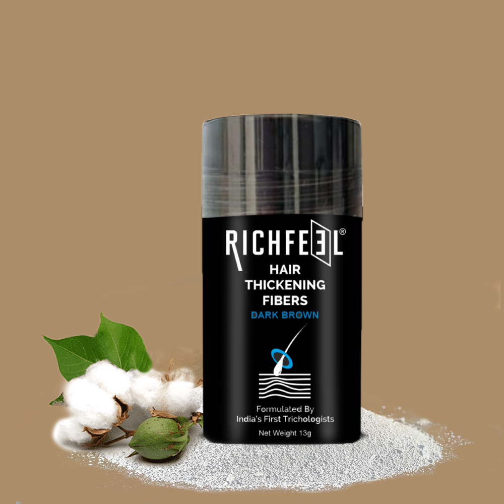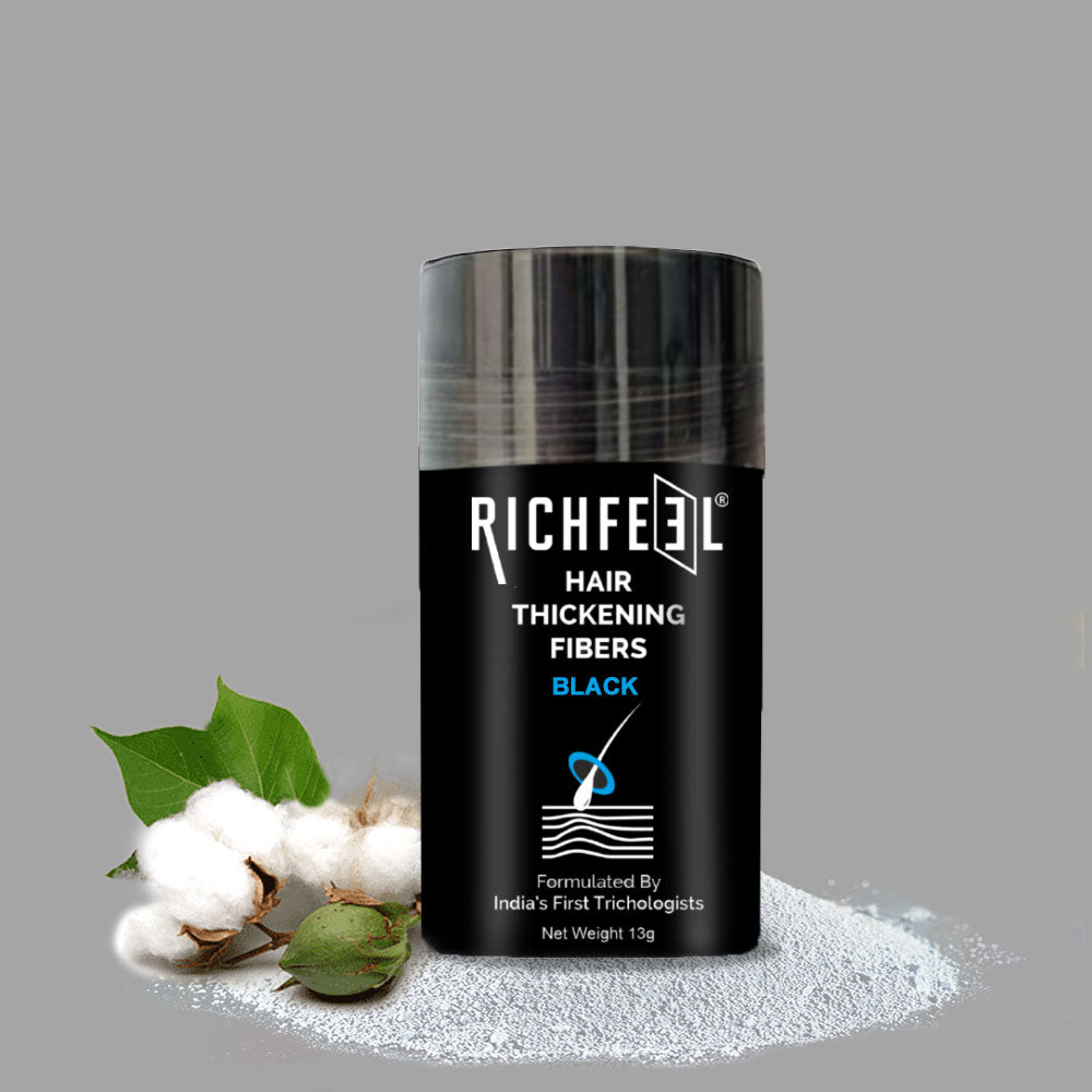 Richfeel Thickening Hair Fibre is your instant fix for the look of fuller, thicker hair. Expertly created by India’s first OG trichologists, this lightweight, plant-derived fibre blend uses cellulose powder to add natural volume to your hair. It has hydrolyzed corn protein which strengthen your strands and cellulose gum to lock in moisture and smooth texture. It instantly camoflouges thinning areas, it gives hair a soft, natural finish without weighing it down. Suitable for all hair types and gentle enough for daily use—because confidence begins with thicker-looking, healthier hair.