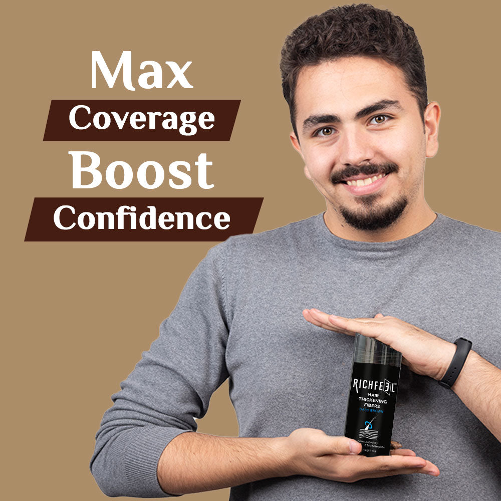 What makes it special ? Born from 40+ years of Richfeel’s clinical hair care expertise, this formula merges cutting-edge hair-thickening technology with pure plant-based fibres for safe, instant, and natural results. Free from harsh chemicals, parabens, and synthetic dyes, it delivers lasting fullness without damaging your hair or scalp. Feel the difference from the very first use—because your hair deserves nothing less than full-bodied confidence.